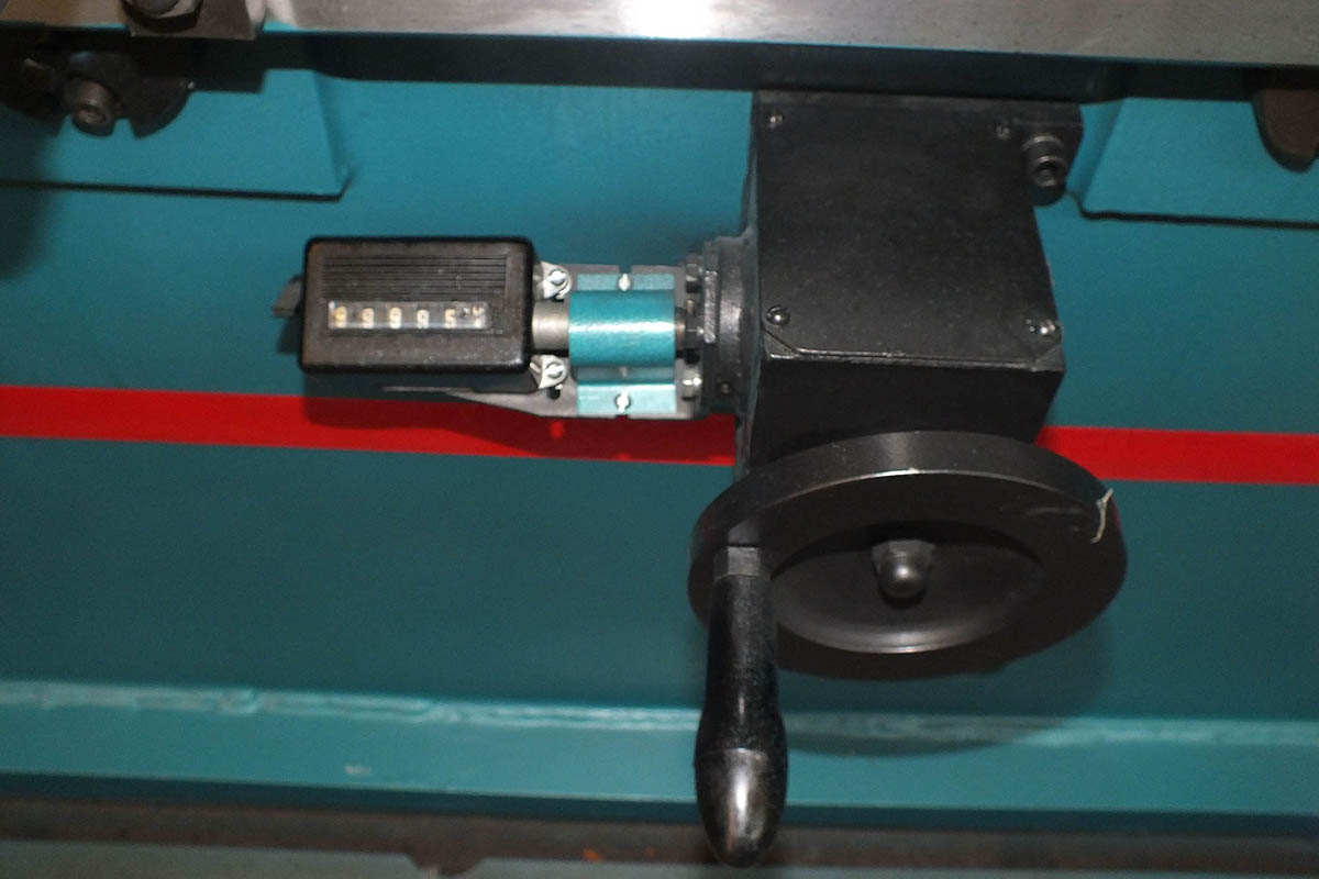 Рама заднего упора с узлами перемещения устанавливается в "T" - образные пазы стола станины пресса. В зависимости от хода заднего упора и конструкции листогибочного пресса, для большей жесткости упор может снабжаться двумя дополнительными опорными стойками. Данный вид упора имеет длину перемещения - 750 мм. Привод данного упора осуществляется вручную, с помощью штурвала, выведенного на переднюю часть станины пресса. Контроль перемещения по оси "X" производится при помощи механического счетчика оборотов модели СО-66. Движение балки с упорами происходит с помощью пары винт-гайка. Перемещение узлов упора по осям "R1", "R2", "Z1" и "Z2" осуществляется вручную.