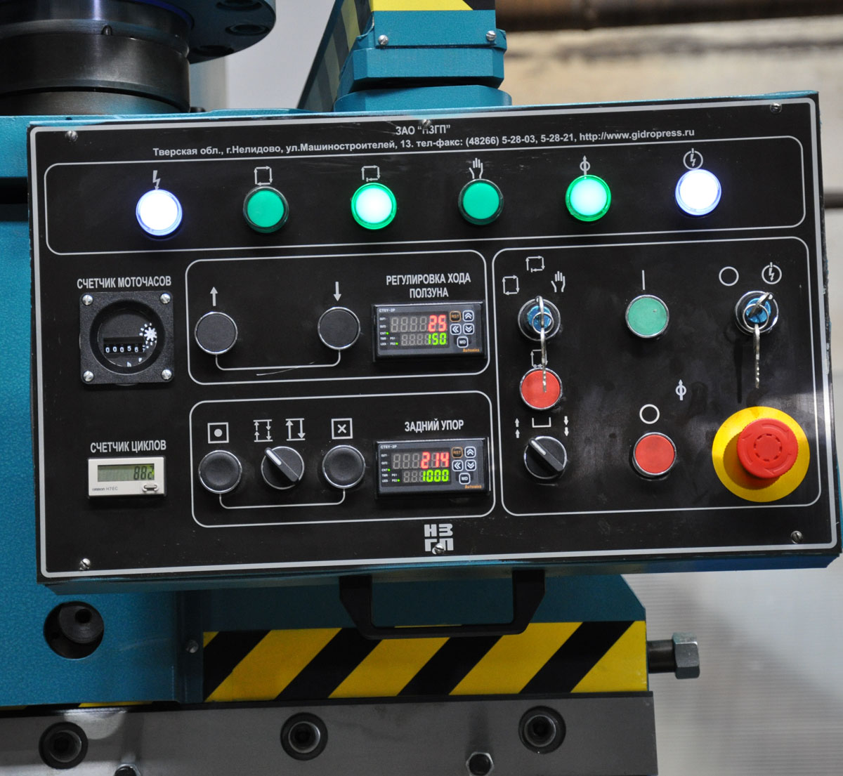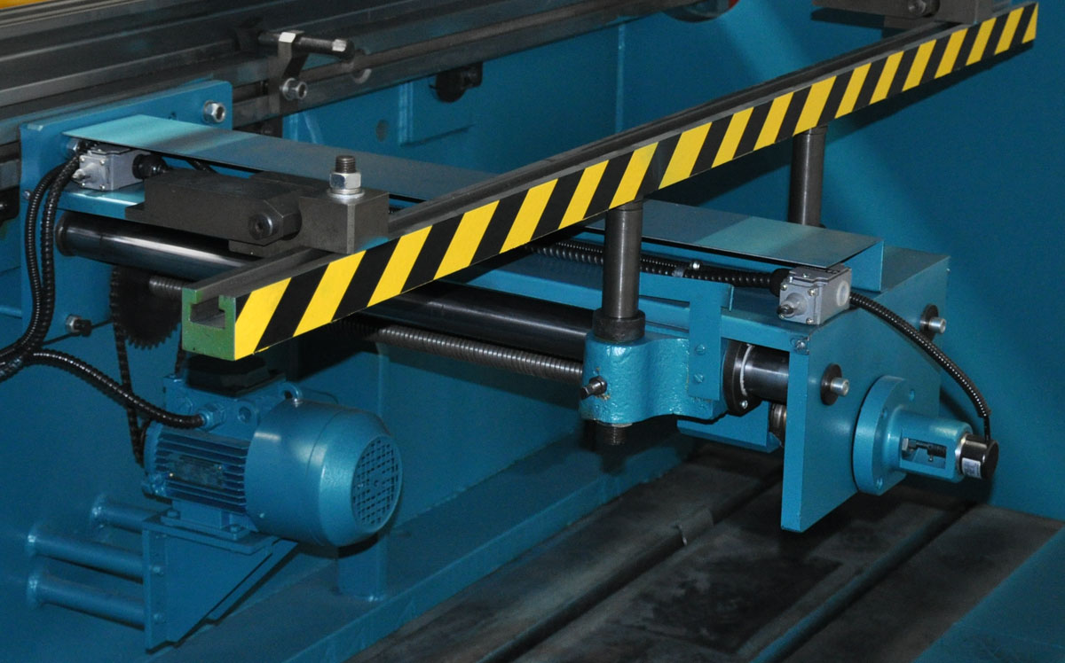 У заднего упора данного вида узлы перемещения располагаются на боковых стойках станины. Для перемещения балки с упором по оси "X" используется две винтовые пары (винт-гайка), приводимые в движение асинхронным электродвигателем. Для исключения инерции движения упора установлен электродвигатель с встроенным тормозом, что позволяет достигать соответствующей точности позиционирования. Контроль перемещения по оси "X" осуществляется от датчика энкодера, сигнал которого поступает на устройство цифровой индикации (УЦИ), расположенное на пульте управления прессом. Перемещение узлов упора по осям "R1, "R2", "Z1" и "Z2" осуществляется в ручную.