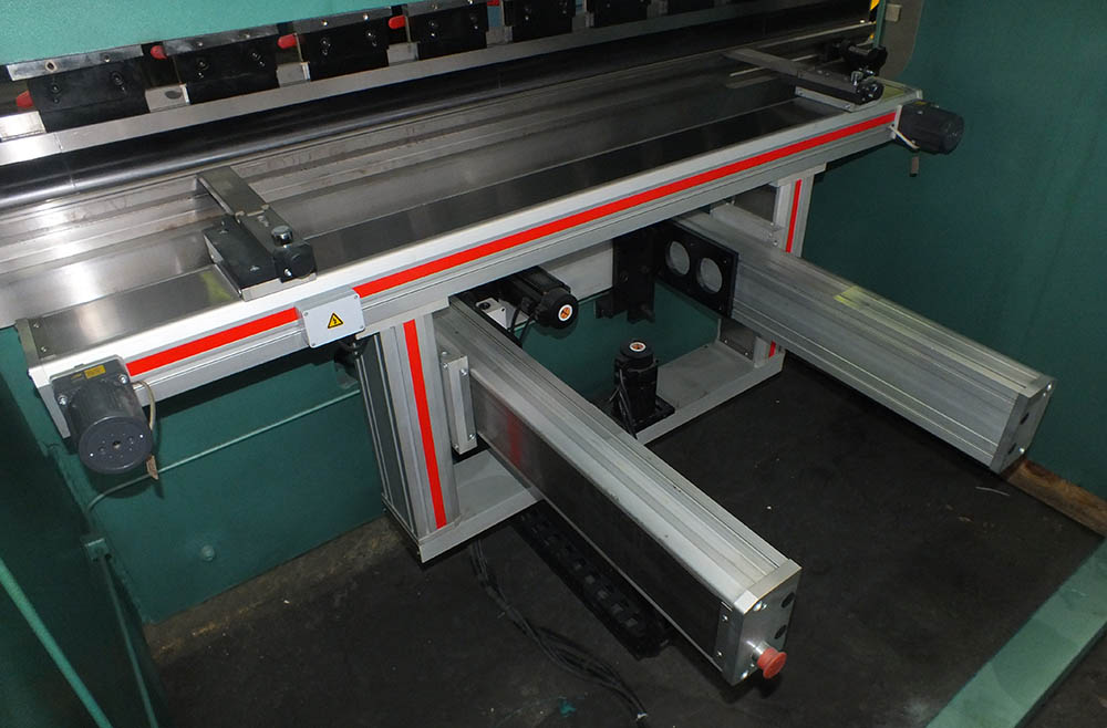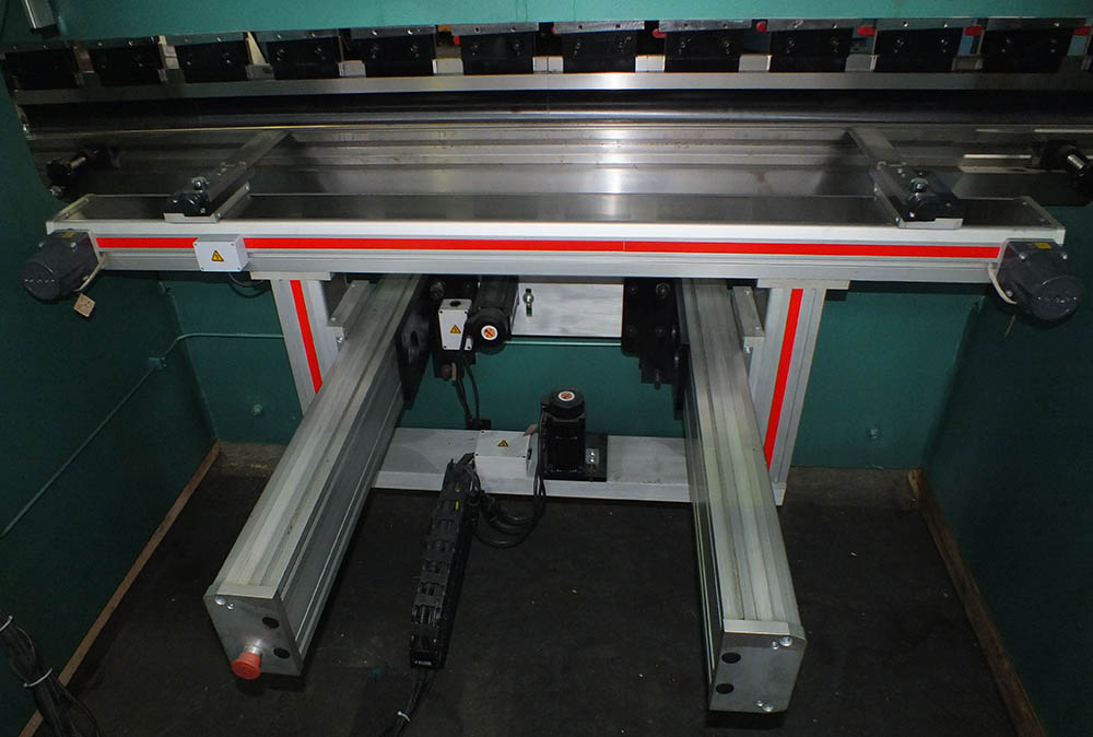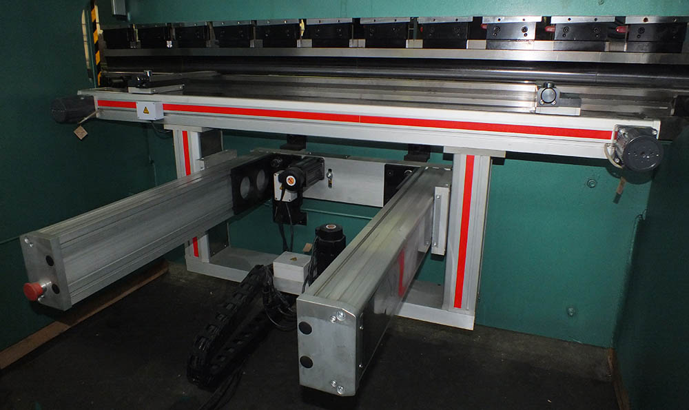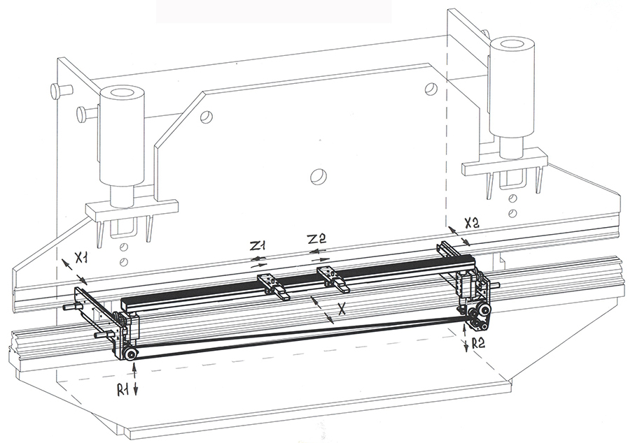 Конструкция данного упора относится к классу повышенной точности. Для станков с ЧПУ с контролируемым перемещением по оси "X1", "X2", "R1", "R2", "Z1" и "Z2" поставляются упоры башенного типа с креплением как к столу пресса (для малогабаритных моделей), так и к основанию прессов с большой длиной гиба (от 5 м.). Длина перемещения от 500 мм. - 2000 мм. Стоимость таких упоров достаточно высока, поэтому их установка требует серьезной оценки экономической составляющей деятельности, проводимой на листогибочном прессе с данным видом заднего упора.