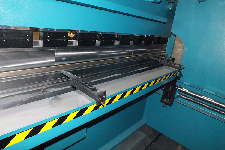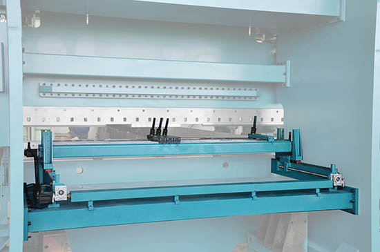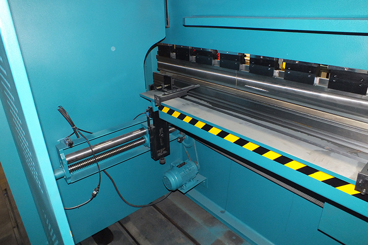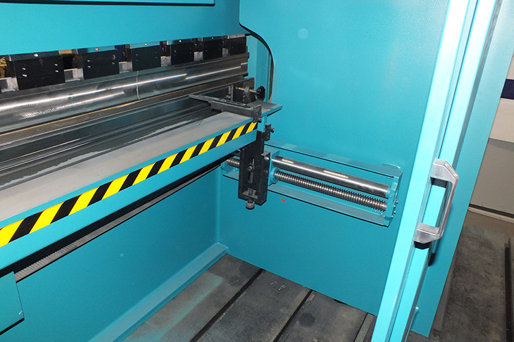 Рама заднего упора с узлами перемещения устанавливается в "T" - образные пазы стола станины пресса. В зависимости от хода заднего упора и конструкции листогибочного пресса, для большей жесткости упор может снабжаться двумя дополнительными опорными стойками. Данный вид упора имеет длину перемещения - 750 мм. Привод данного упора осуществляется вручную, с помощью штурвала, выведенного на переднюю часть станины пресса. Контроль перемещения по оси "X" осуществляется от датчика энкодера, сигнал которого поступает на устройство цифровой индикации (УЦИ), расположенное на пульте управления прессом. Движение балки с упорами происходит с помощью пары винт-гайка. Перемещение узлов упора по осям "R1", "R2", "Z1" и "Z2" осуществляется вручную.