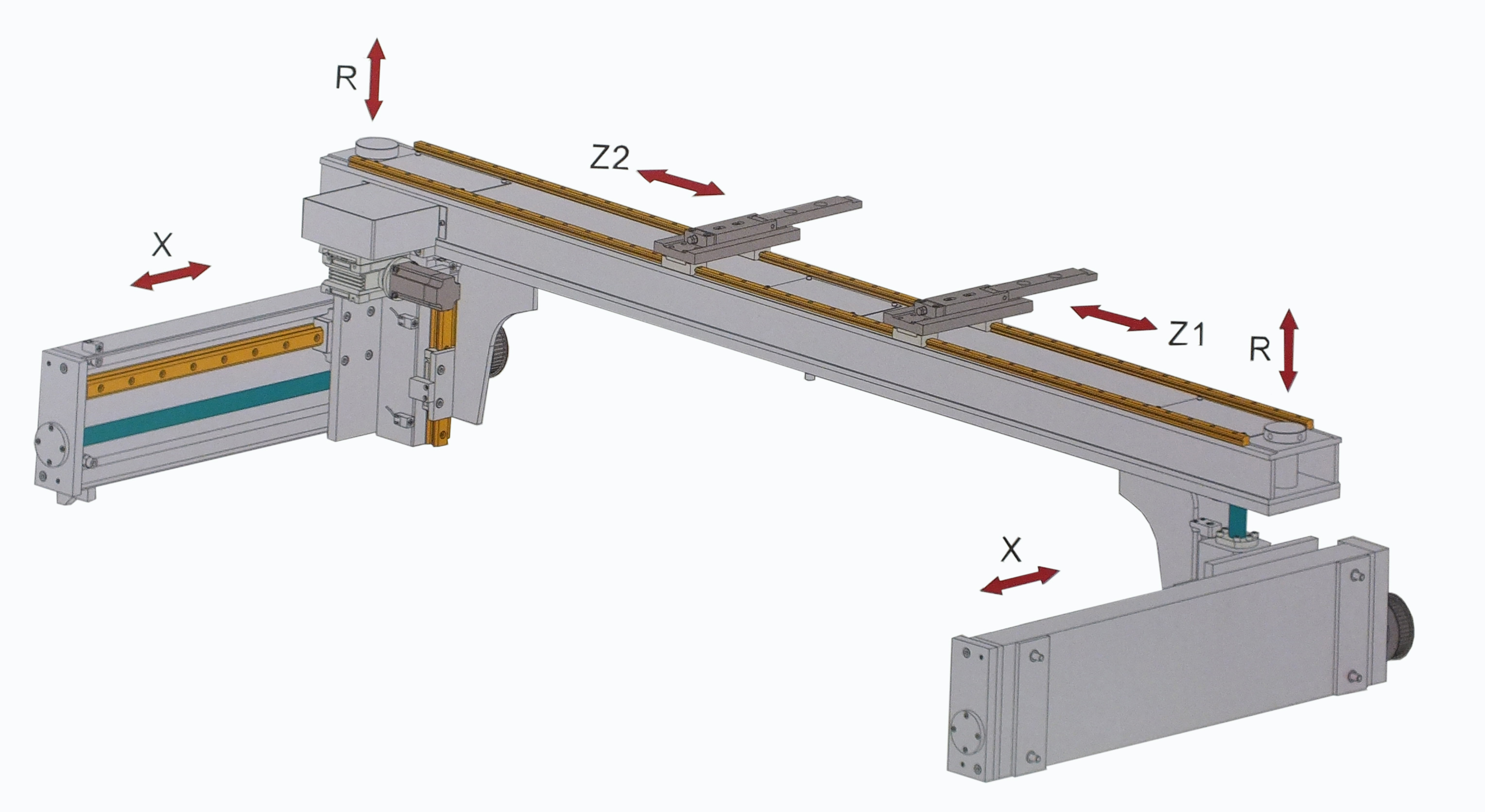 Конструкция данного упора относится к механизмам с особо точным позиционированием. У заднего упора данного вида узлы перемещения располагаются на боковых стойках станины. Для перемещения балки с упорами по оси "X" используется две ШВП, приводимые в движение серводвигателем фирмы "BOSCH". Контроль перемещения оси "X" осуществляется с помощью встроенного в сервопривод датчика положения. Перемещение узлов упора по осям "R1", "R2", "Z1" и "Z2" осуществляется вручную.